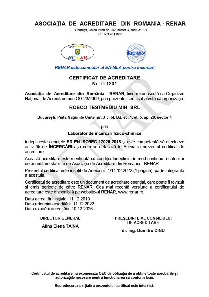 - Certificare RENAR – LI 1201 – conform ISO/IEC 17025:2018